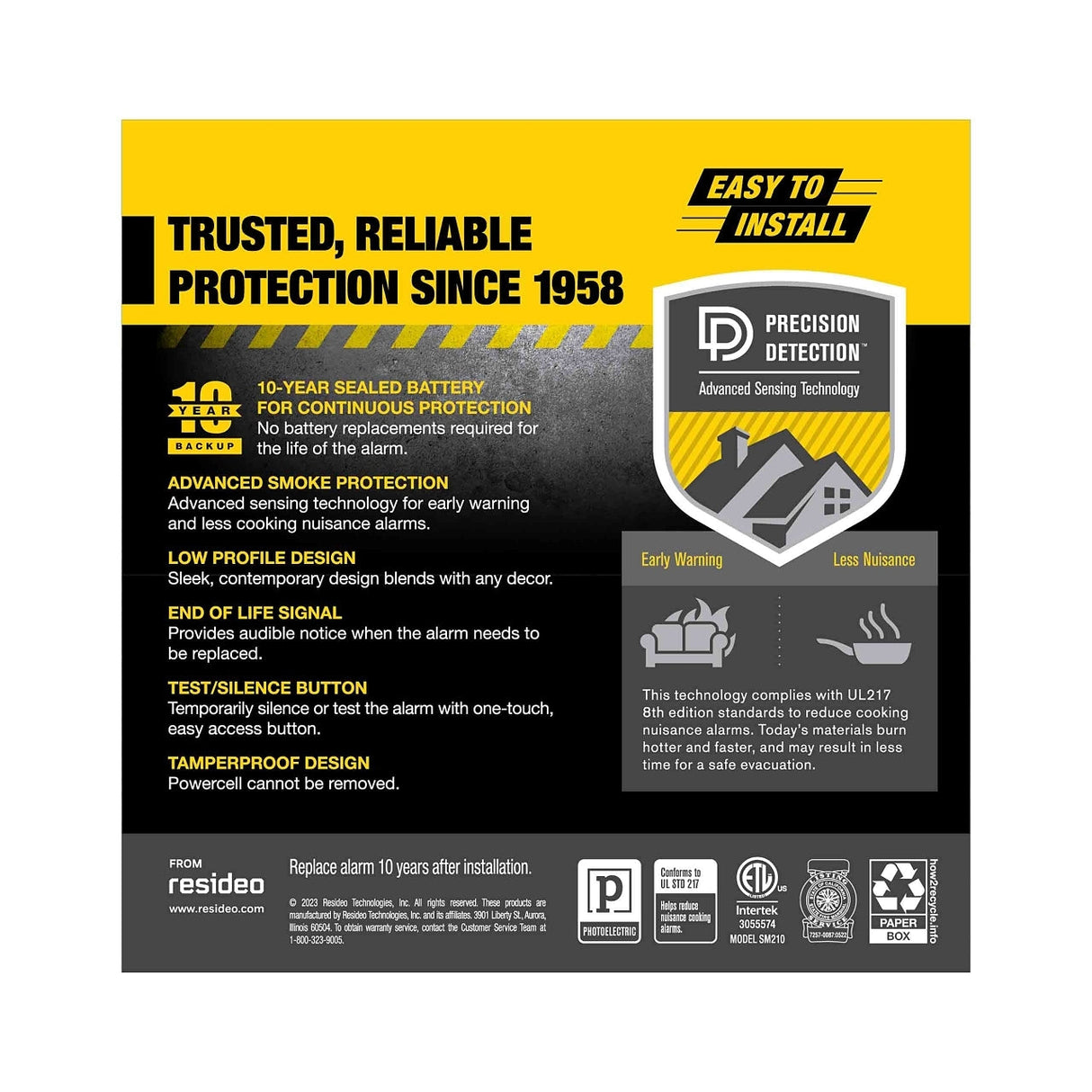 - 10-Year Sealed Battery, for continuous protection. No battery replacements required for the life of the alarm.